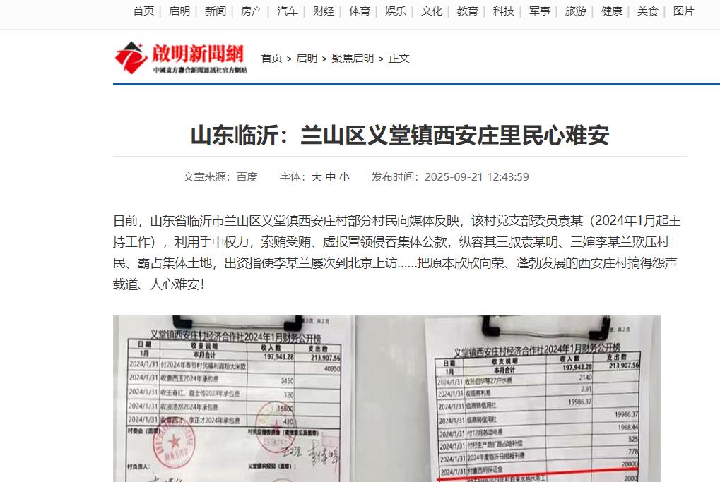 日前,山东省临沂市兰山区义堂镇西安庄村部分村民向媒体反映,该村党支部委员袁某(2024年1月起主持工作),利用手中权力,索贿受贿、虚报冒领侵吞集体公款,纵容其三叔袁某明、三婶李某兰欺压村民、霸占集体土地,出资指使李某兰屡次到北京上访……把原本欣欣向荣、蓬勃发展的西安庄村搞得怨声载道、人心难安!