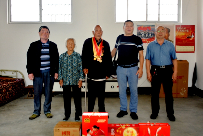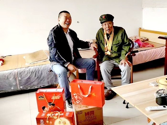 大众印象网讯(张春兄 冯爱云)传承红色基因,凝聚红色力量。9月28日,值国庆中秋双节将至之际,在临沂市退役军人事务局和费县退役军人事务局的支持帮助下,沂蒙红哥尹志林千场沂蒙精神宣讲活动第195场,来到费县胡阳镇万福庄村,专程探望98岁抗战老兵郑国敬。山东省志愿服务联合会理事、山东省职工达人、沂蒙精神传承人、沂蒙精神传承爱心大使、沂蒙红哥尹志林,带着精心准备饱含深情敬意的慰问品,在胡阳镇退役军人服务站站长张中方的陪同下,与老英雄的儿子等人一起,回忆老人家在抗日战争、解放战争和抗美援朝战争时期的那段峥嵘岁月。