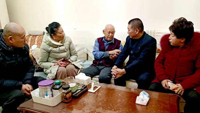 大众印象网讯(尹志林、张春兄)传承红色基因,凝聚红色力量。1月4日,山东省志愿服务联合会理事、山东省职工达人、沂蒙精神传承人、临沂市志愿服务联合会副会长、沂蒙精神传承爱心大使、沂蒙红哥尹志林千场沂蒙精神宣讲活动第214场,来到临沂市兰山区柳青街道办事处银盛泰·博观新城小区,专程拜访慰问95岁的抗战老兵王振环。临沂鼎力窗帘布艺集团有限公司法人王凤英、临沂市润康明视力养护中心经理王水晴、志愿服务者诸葛祥召等参加活动。